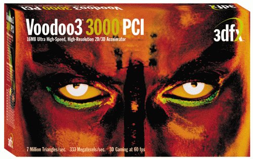 Looking for a no-frills PCI graphics card that can kick your anemic 3-D games into high gear? Consider the Voodoo3 3000 PCI from 3dfx. This 16 MB graphics card supports more 3D APIs than many competing products, offers glass-smooth performance for most games, and won't break the bank. We were a little disappointed when we opened the box, as the Voodoo3 3000 comes with no software bundle. A voucher is included for a software DVD decoder, but it would be much better if 3dfx just included the soft...Read More at Amazon.com